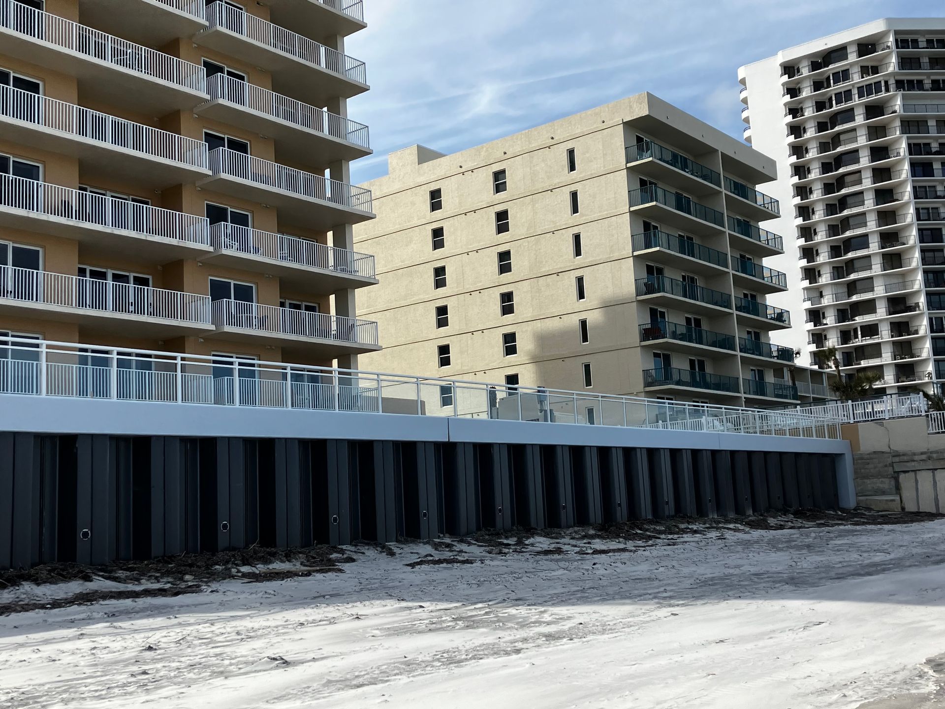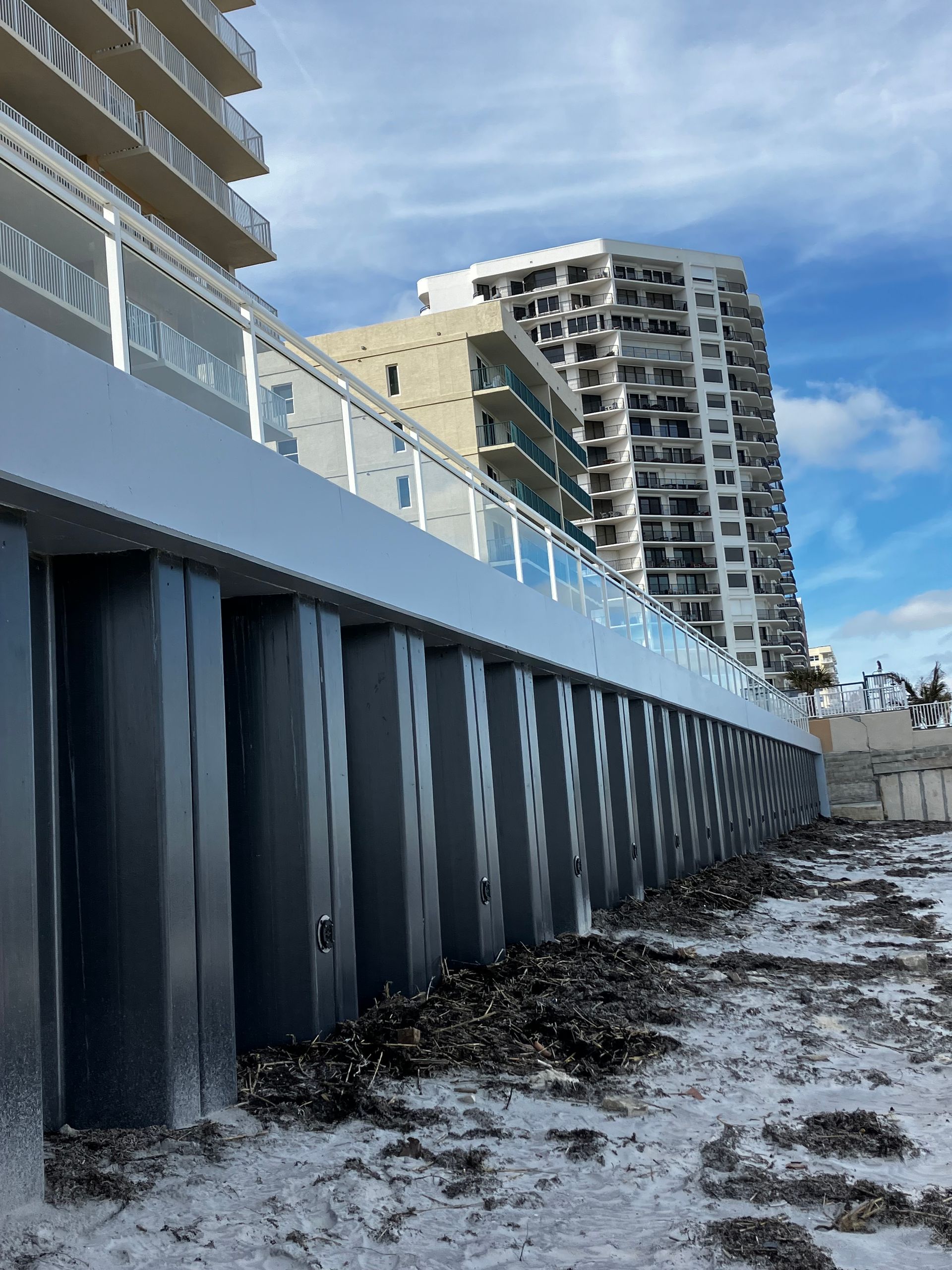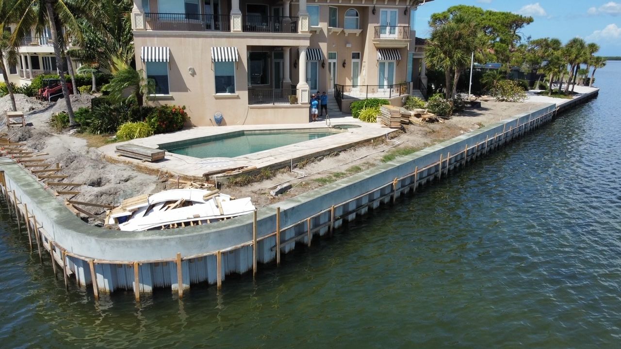The DiMucci Towers were hit by hurricanes Ian and Nicole in 2022 washing nearly a third of their property into the ocean. Their twelve foot high seawall of 50 years was gone leaving the building completely exposed to the sea. Enter Florida Seawall Solutions to replace the 400 foot long wall with a new state-of-the-art, high tech wall.