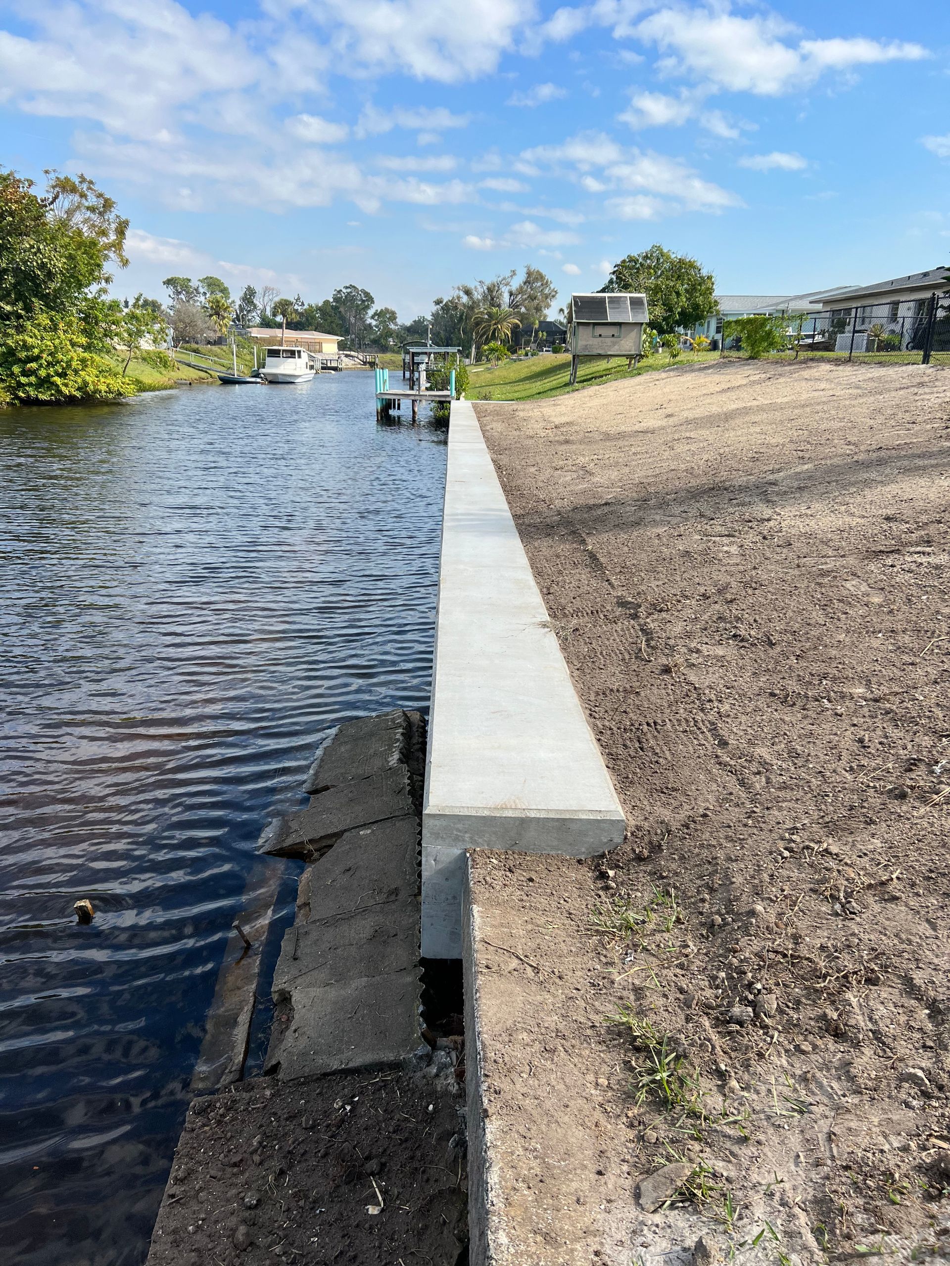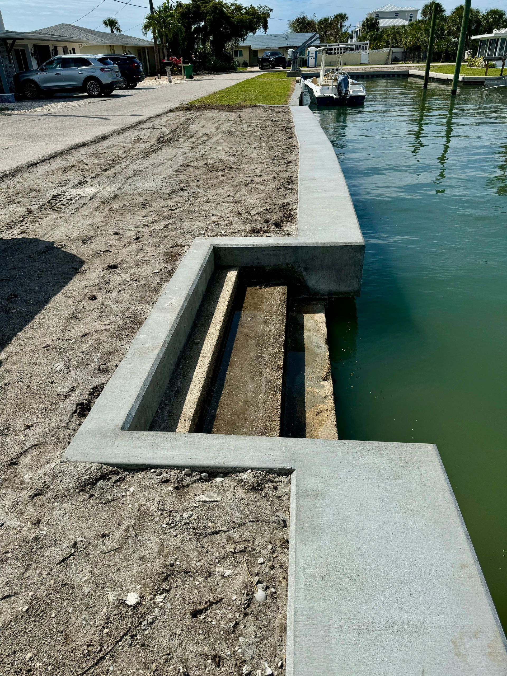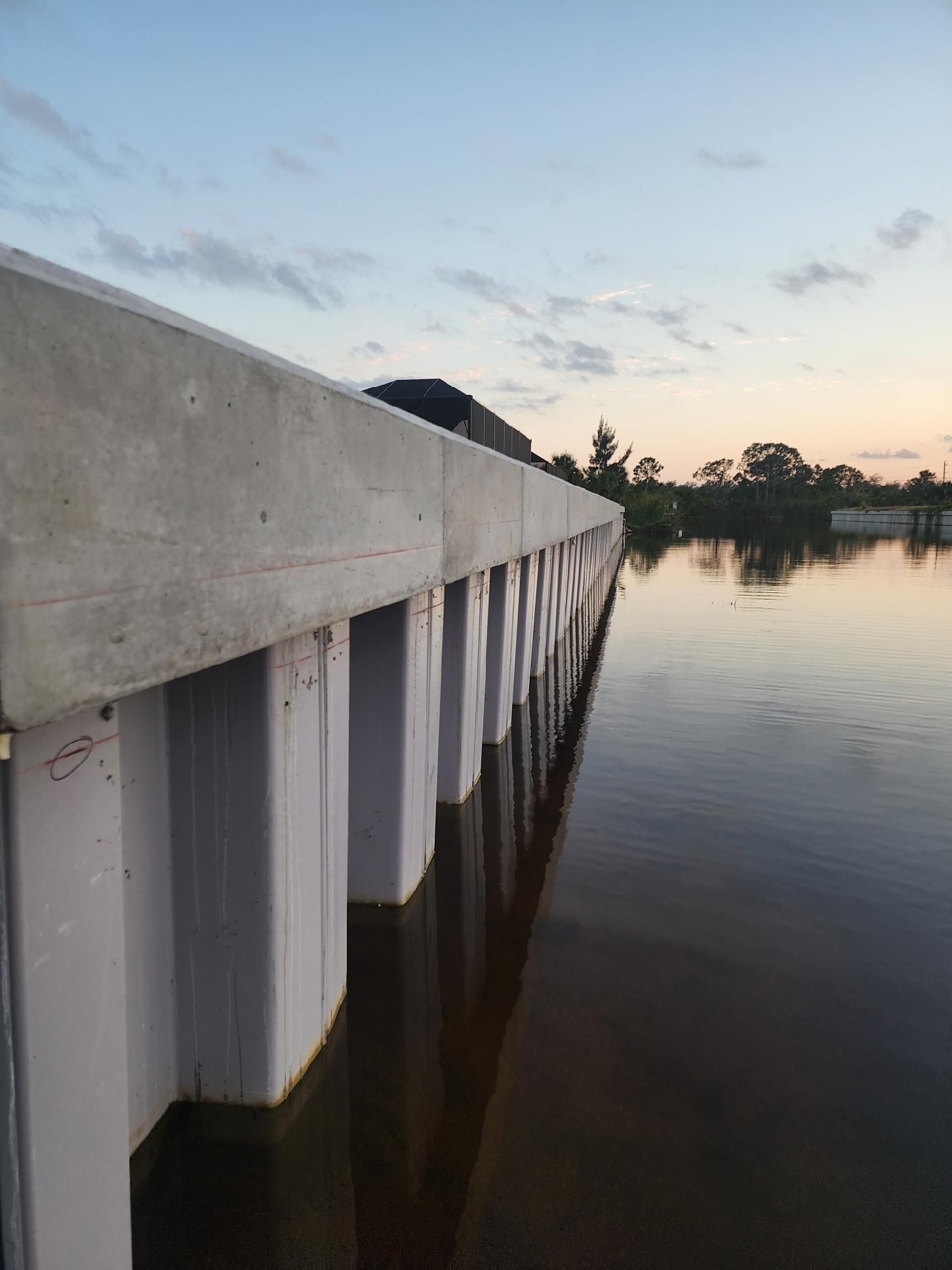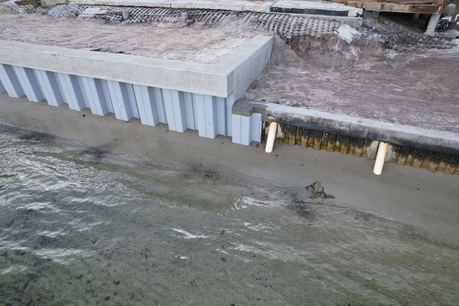 FSS installed a new vinyl seawall in front of his existing seawall, using a mixture of 16 and 18 foot panels combined with a 2x2 foot concrete cap. To add extra support, FSS filled in between the existing and old walls with concrete.