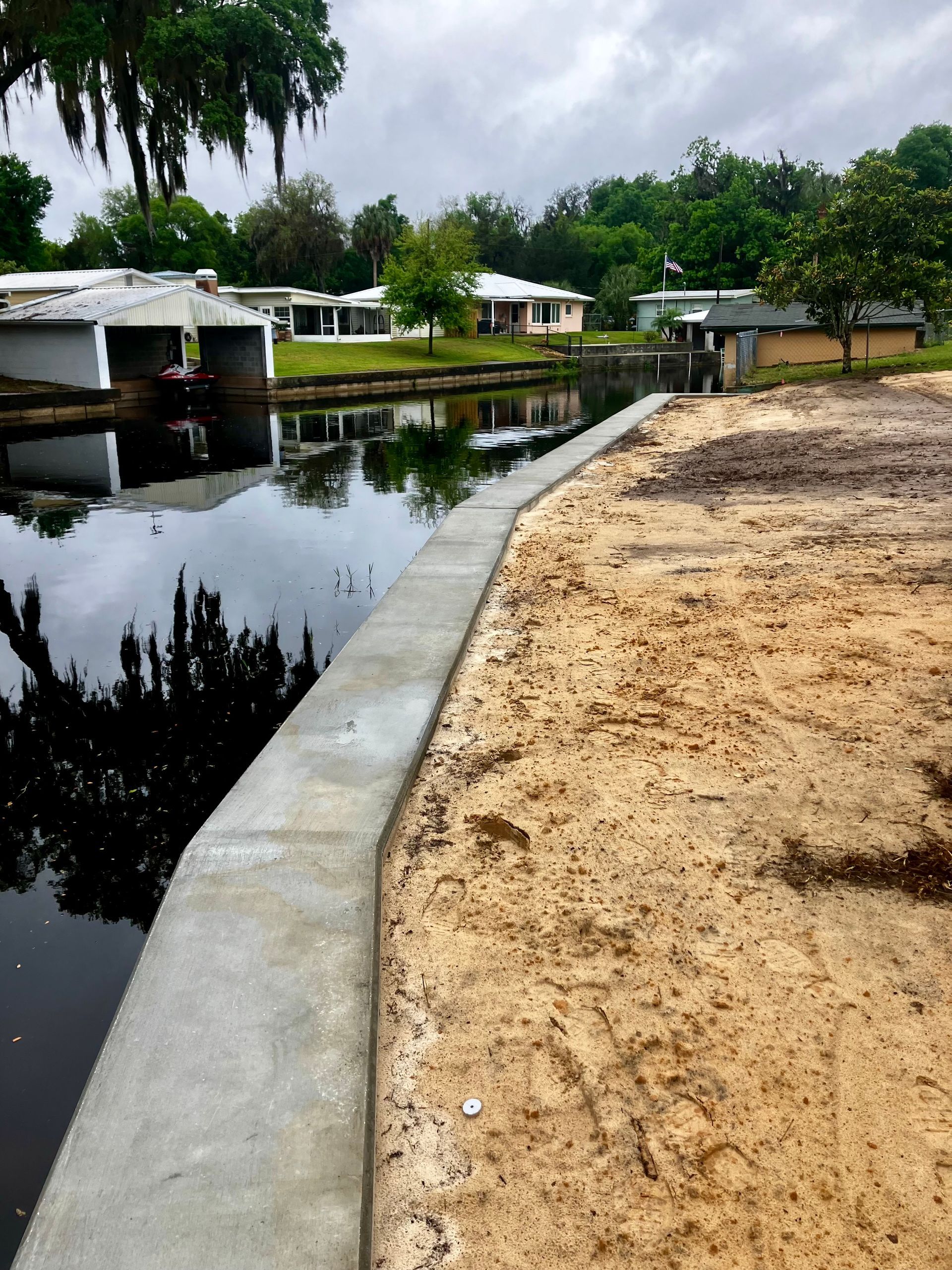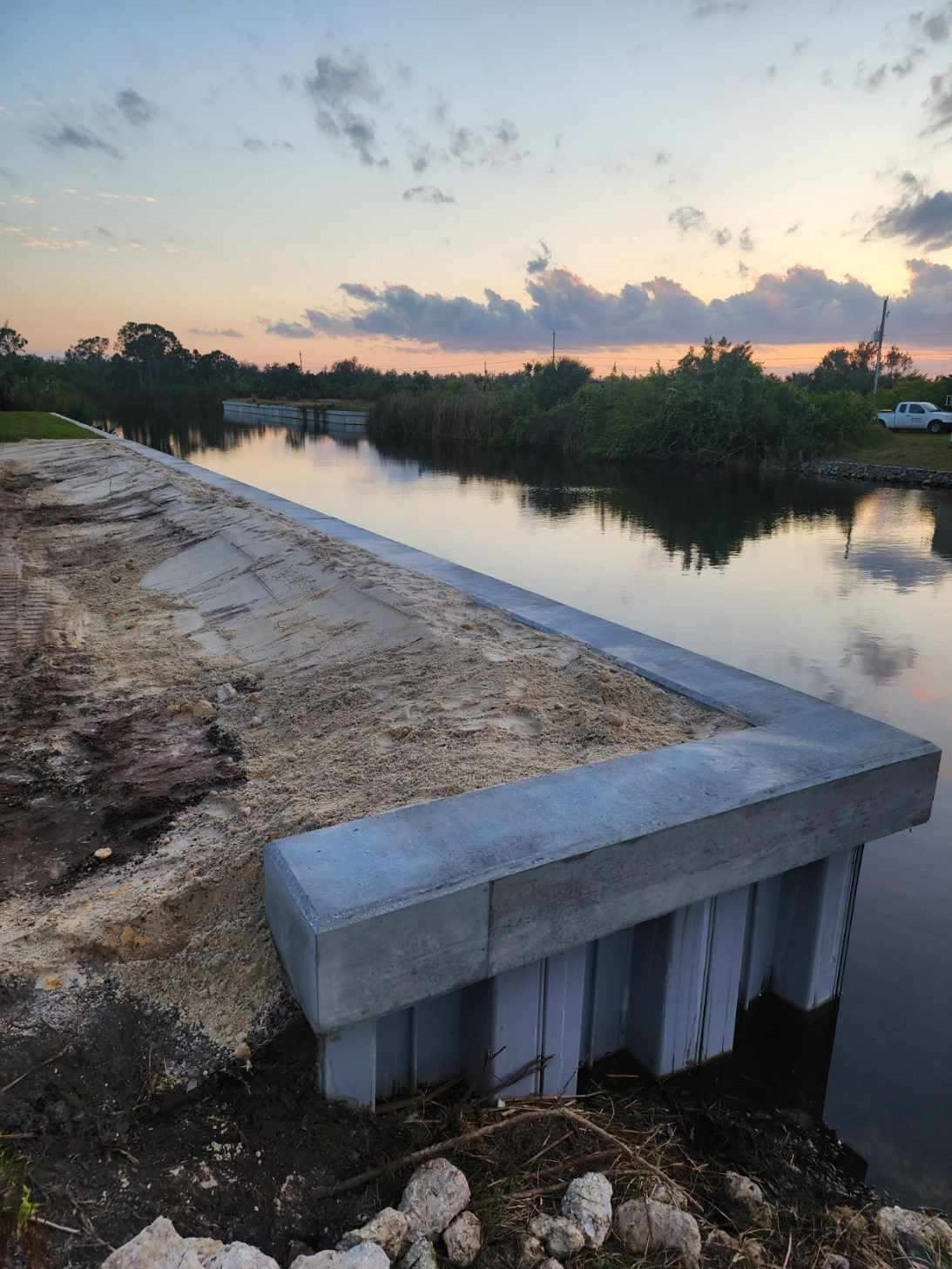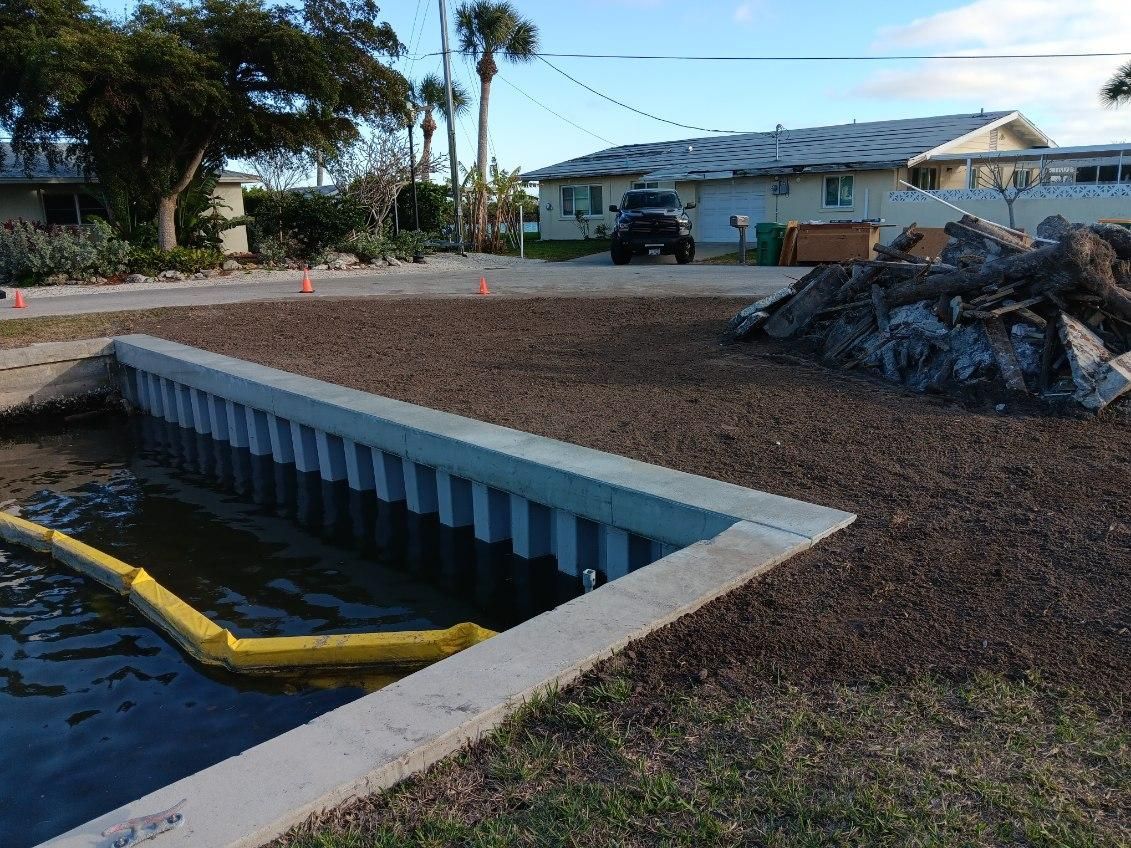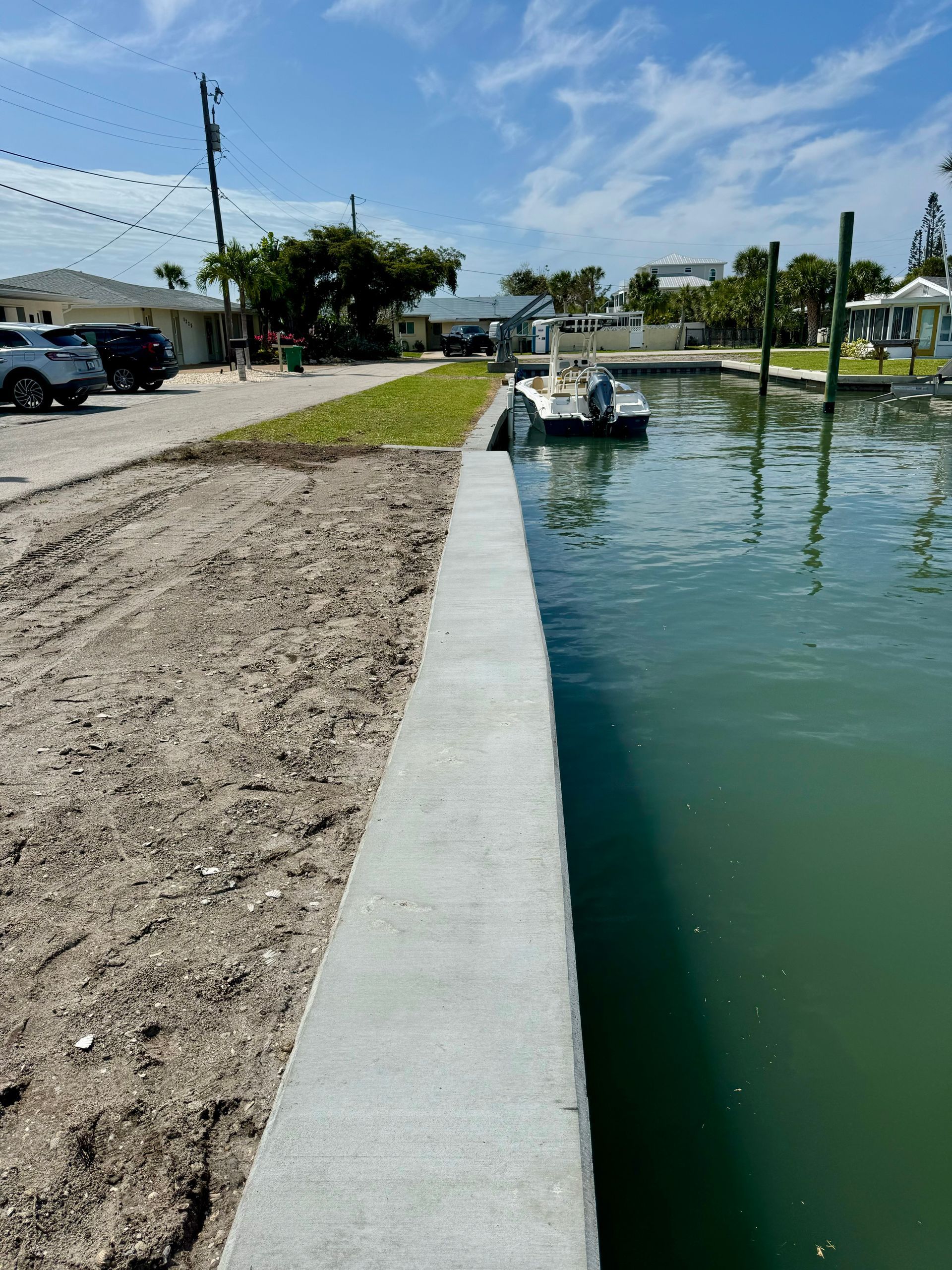 FSS installed a new vinyl seawall in front of his existing seawall, using a mixture of 16 and 18 foot panels combined with a 2x2 foot concrete cap. To add extra support, FSS filled in between the existing and old walls with concrete.