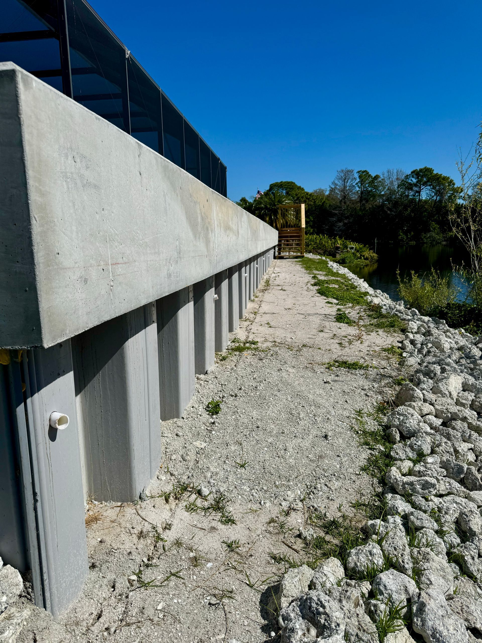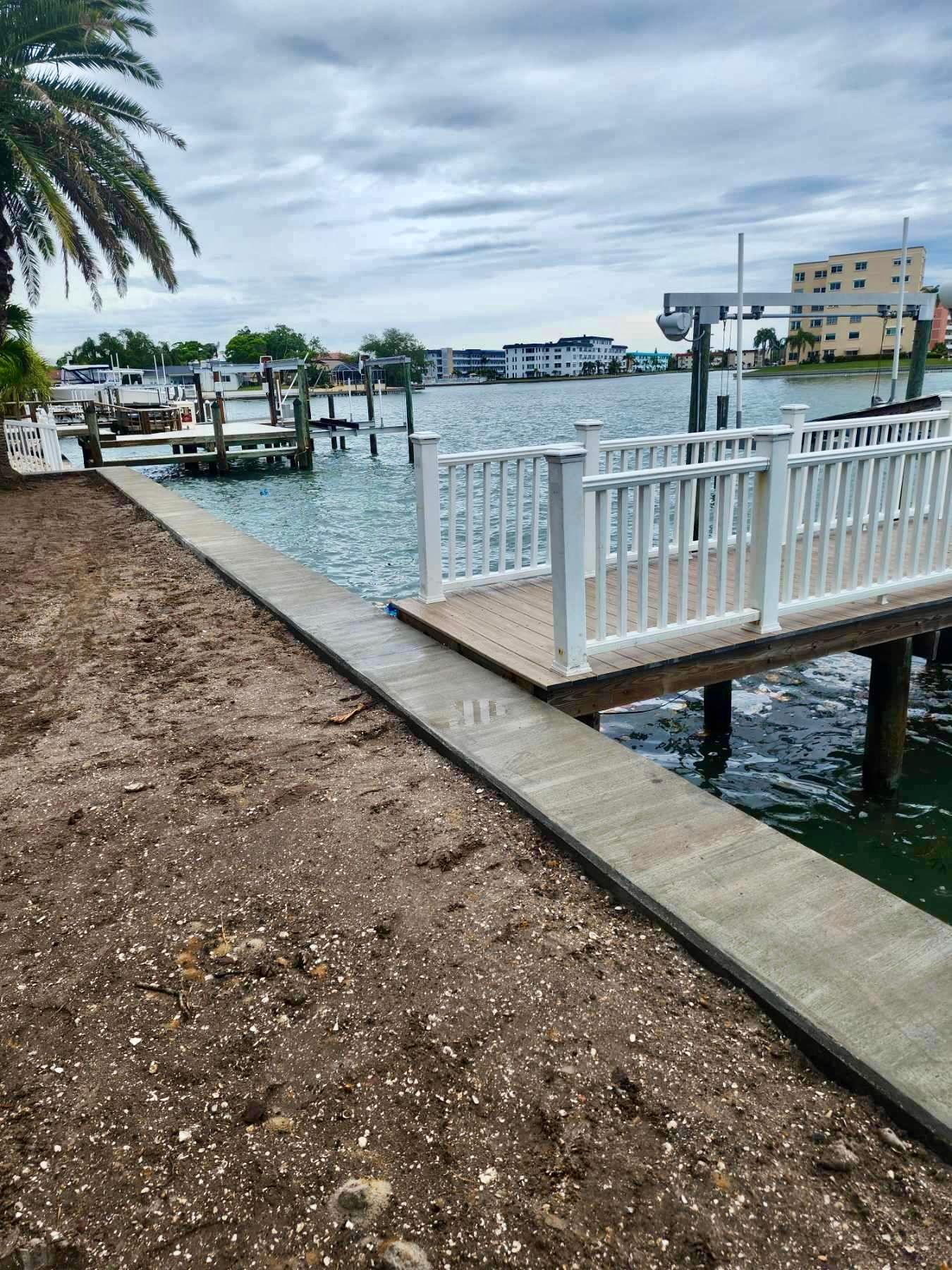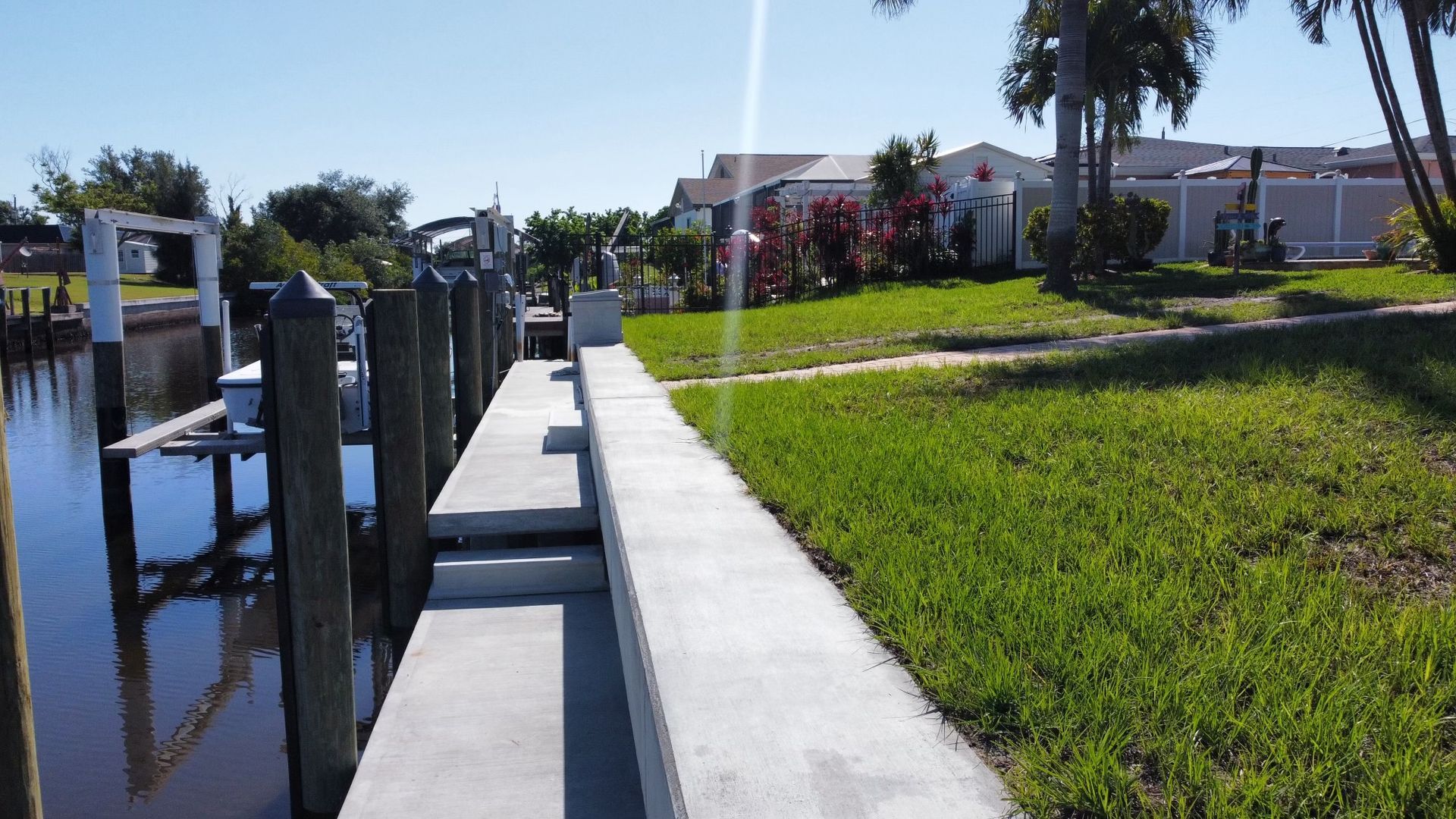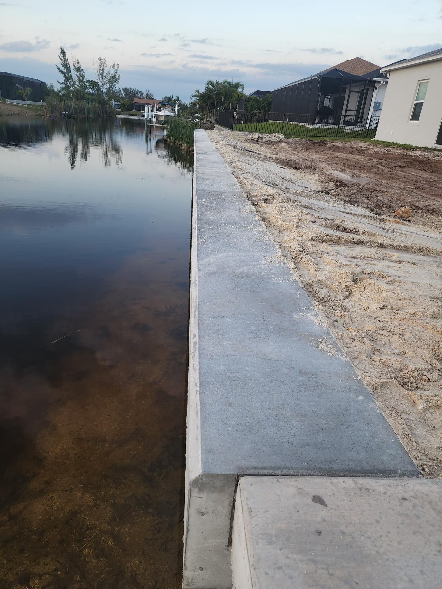FSS installed a new vinyl seawall in front of his existing seawall, using a mixture of 16 and 18 foot panels combined with a 2x2 foot concrete cap. To add extra support, FSS filled in between the existing and old walls with concrete.